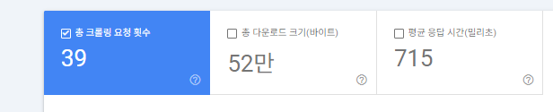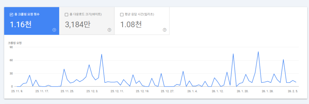 구글 서치 콘솔에 설정 메뉴에 크롤링 통계 보고서가 있습니다. 여기에 크롤링 평균 응답 시간이 1.08초였습니다. 제미나이에 물어보니 구글봇이 원활하게 크롤링하려면 서버 응답 시간이 500밀리초 이하여야 한다고 합니다. 제 사이트는 그 두 배가 넘는 시간이 걸리고 있었습니다.