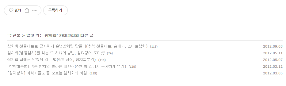 입질의 추억이라는 블로거도 있습니다. 수산물 분야의 전문가인데, 참치 부위 분석 글만 좋아요 971개를 받았어요.