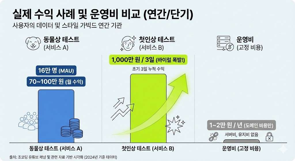 조코딩님이 직접 공개한 지표를 보면, 잘 만든 AI 서비스 하나는 진정한 ‘디지털 부동산‘이에요. 한 번 만들어두면 계속 돈을 벌어주니까요.