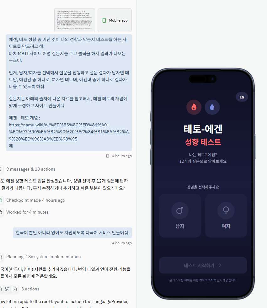 Replit 에이전트에게 자연어로 명령을 내려요. “나무위키의 특정 정보를 참고해서 테토에겐 테스트 사이트를 만들어줘”라고 입력하면 AI가 전체 구조를 설계합니다.