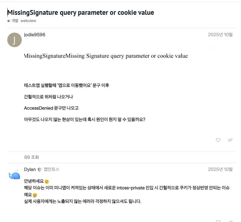 앱인토스 에러 MissingSignature query parameter or cookie value