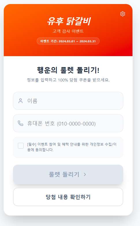 기본적으로 이름과 전화번호를 입력하고, 룰렛 돌리기를 시작합니다. 그리고 저는 담청 내용 확인하기 버튼을 추가로 만들었는데요. 보통 캡처 이미지를 보여주게 되면 사람들이 너도나도 다운로드해서 쓰기 때문에 번호 수집에 문제가 생깁니다. 사장님 사진도 어떻게 보면 꽝이겠죠.