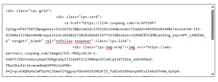 처음에는 위의 코드를 직접 수작업으로 입력해서 넣으면 쿠팡 파트너스에 호출해서 정보를 뽑아 오는 기능을 만들었는데요. 만족은 잠깐이었습니다. 그것을 언제나 복사해서 붙여 넣어야 한다는 생각이 들었습니다.