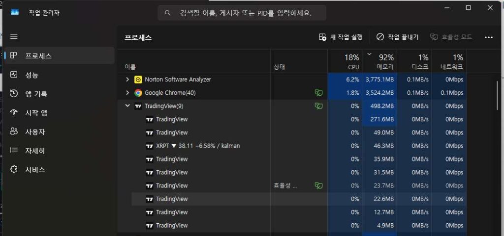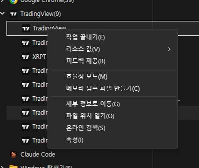 작업관리자를 선택 > 프로세스 > 이름에 Tradingview 선택합니다.