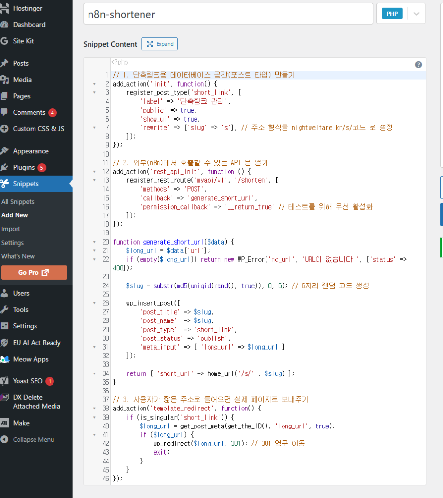 - 자체 구축(추천): 아까 말씀드린 워드프레스 Code Snippets 방식을 사용하면, 내 서버를 이용하기 때문에 평생 무료/무제한으로 사용할 수 있습니다.