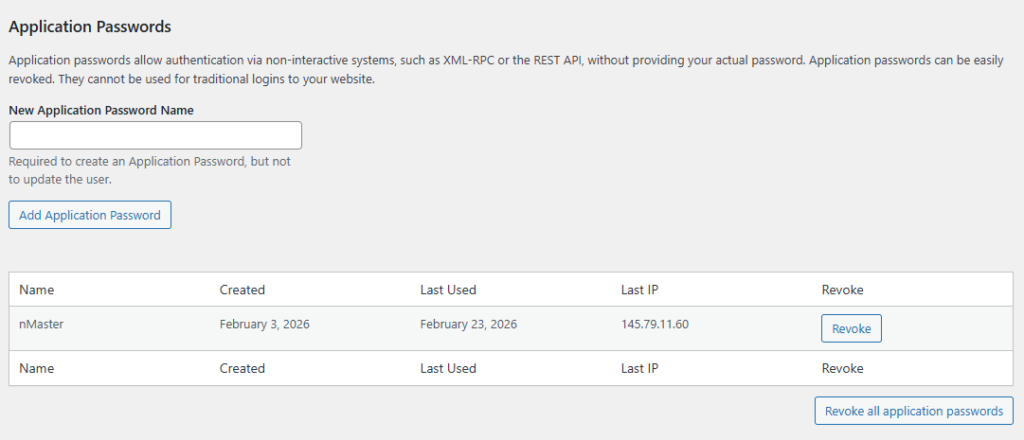 맨 아래로 내려가면 Application Passwords 섹션이 있습니다.