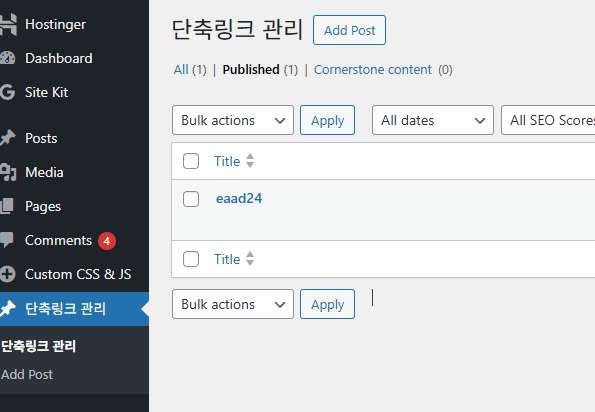 단축링크 관리 메뉴도 생겼습니다. 잘못 발행된 링크는 삭제할 수 있습니다. 다만 가져오는 링크의 제목이 표시되면 좋을 텐데 아직 그렇지 못합니다. 나중에 기능을 추가해봐야겠어요. 처음에 생성되고 나서 없는 링크라고 나올 때는 설정 → 포스트 링크에서 저장을 다시 눌러주세요. 그러면 됩니다.
