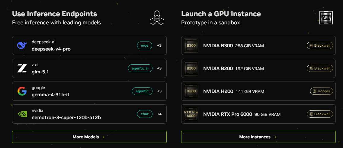 - 모델 직접 테스트 (Free Inference): DeepSeek, Gemma, Nemotron 등 NVIDIA 서버에 올라가 있는 최신 AI 모델들을 브라우저에서 채팅하듯 바로 써볼 수 있습니다.