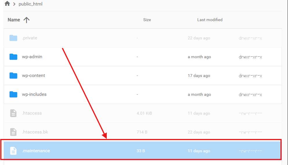 .maintenance 파일이 표시될 것입니다. 이 파일을 삭제하면 사이트에 정상 접속이 됩니다.
