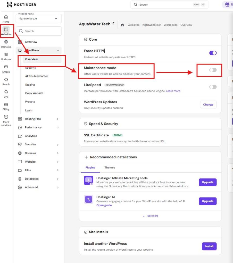 .maintenance 파일 방식도 동작하지만 메시지가 단순한 편입니다. Hostinger에서는 자체 유지보수 기능도 제공합니다. 이미지의 메뉴에서 유지보수 모드를 활성화할 수 있습니다.